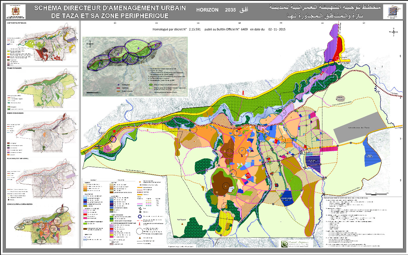 NB: Au niveau du champ d'intervention de l'AUT, le Schéma directeur d'aménagement urbain (SDAU) de la ville de Taza et sa zone périphérique est homologué par décret N°2.15.591 publié au bulletin officiel N°6409 du 02-11-2015.